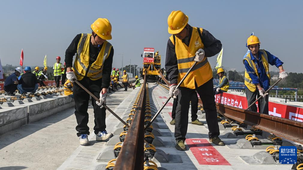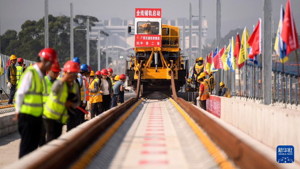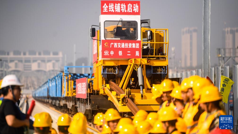 新华社南宁12月20日电(记者梁舜)12月20日,在广西北流市境内的南珠高铁玉林北至岑溪东段铺轨施工现场,铺轨机将首对500米长钢轨平稳铺设在无砟道床板上,这标志着南珠高铁玉林北至岑溪东段进入全线铺轨阶段。