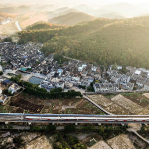 2025年11月26日,一列高铁列车从湖南郴州永兴县板梁古村旁驶过(无人机照片)。新华社记者 赵仲志 摄