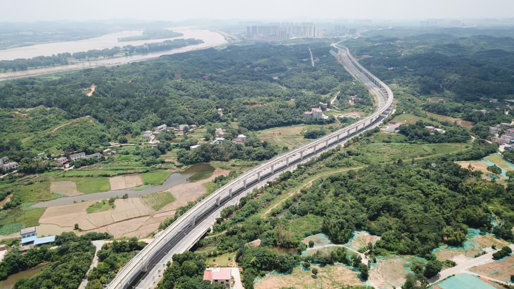 这是2023年6月28日拍摄的长株潭城际轨道交通西环线一期工程的高架轨道(无人机照片)。这是湖南省首条跨市城市轨道交通线路。新华社记者 陈泽国 摄