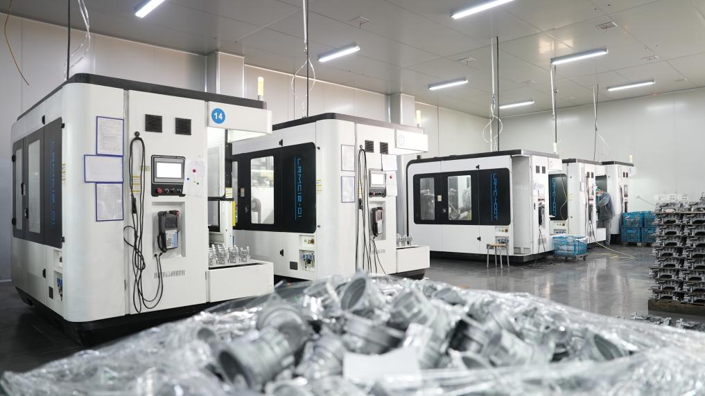 2025年12月19日,普卡科技制造有限公司生产车间内,机器人正在打磨电机外壳。新华社记者 戴斌 摄