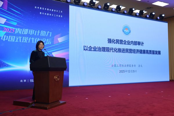 涂文聚焦民营经济高质量发展,指出《中华人民共和国民营经济促进法》施行释放的政策红利,强调民营经济治理现代化刻不容缓。她分享了全国工商联推动民营企业内部审计建设的实践探索,呼吁民营企业主动扛起主体责任,以内部审计规范化推进治理现代化。