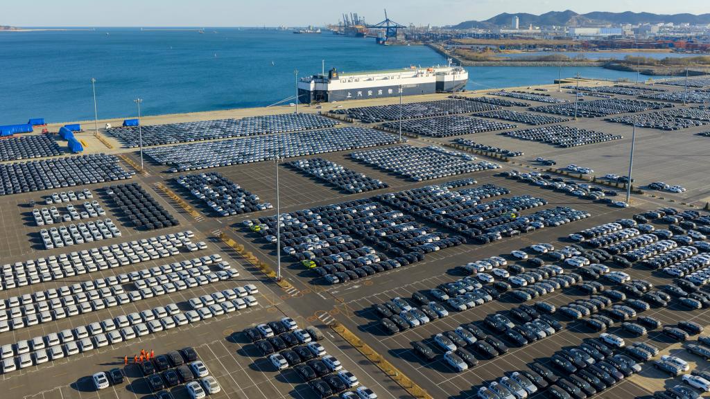在大连汽车码头,商品车整齐停放,等待装船发运(2025年11月摄,无人机照片)。朱万健 摄