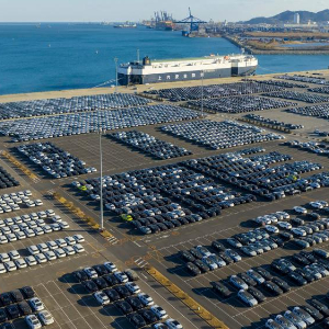 商品车在大连汽车码头整齐停放,等待装船发运(2025年11月18日摄,无人机照片)。新华社发(朱万健 摄)