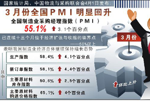 中国物流与采购联合会公布的3月份制造业采购经理人指数(PMI)为55.1%,较上月上升3.1个百分点。该指数已持续13个月保持在50%以上,反映出中国经济已走向稳定和较快增长的轨道。而自2009年10月以来的6个月,仅有2010年2月份PMI指数低于55%,其余月份全都保持在55%以上的高位。