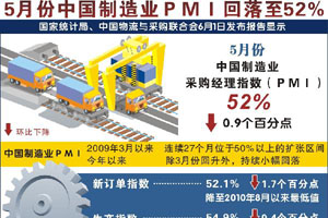 中国物流与采购联合会1日发布数据显示,5月份制造业采购经理指数PMI为52%,环比下降0.9个百分点,连续第二个月出现下行。