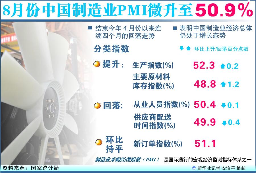 8月份PMI为50.9% 环比回升0.2个百分点