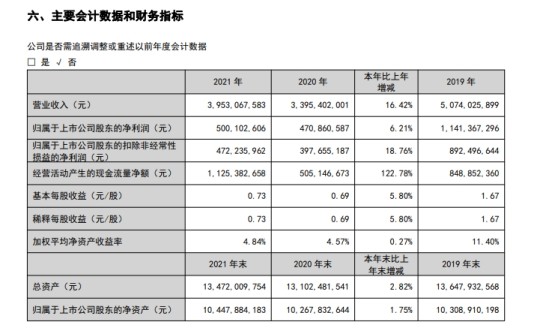 新华网北京4月29日电(胡可璐)4月26日下午,张裕A(以下简称张裕)发布2021年报。公司实现营业收入39.53亿元,同比增长16.42%;净利润为5亿元,同比增长6.21%;基本每股收益0.73元;拟每10股派发现金红利4.50元(含税)。