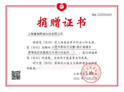 地震发生后,鹰角网络第一时间通过上海市慈善基金会徐汇代表处向震区捐赠200万元现金,并紧急筹措250余万元应急救助物资,通过上海市慈善基金会联系甘肃省当地慈善总会驰援震区,其中包含100台汽油发电机组、30台移动升降照明灯汽油发电机组、5万罐八宝粥、3万片暖身贴、6000余件御寒衣物,用于支持当地救援及灾后重建工作,帮助震区群众平安过冬。