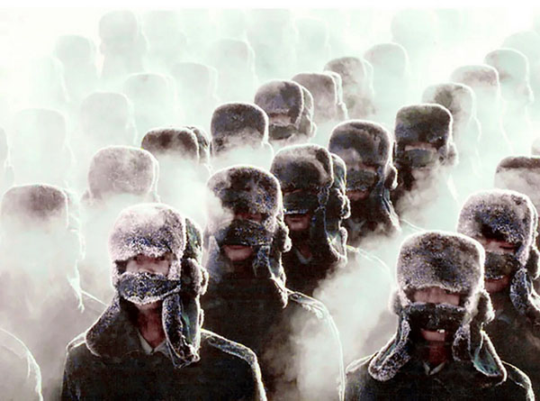 冷的边关热的兵。2001年1月1日,驻守在祖国北极漠河某边防团的新兵出早操。此时,气温零下约50度。赵建伟 摄