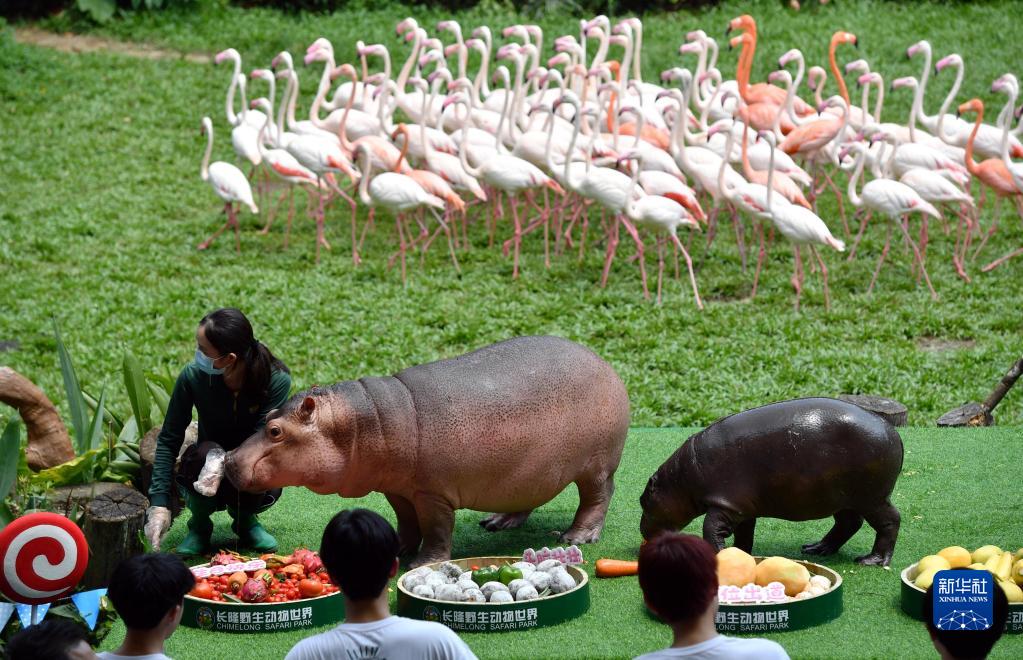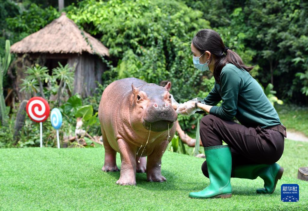 当日,非洲河马菲菲在广州长隆野生动物世界迎来两周岁生日。菲菲是长隆人工育幼长大的雌性河马宝宝,目前体重超过200公斤。新华社记者 刘大伟摄