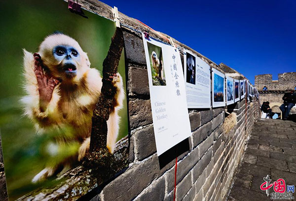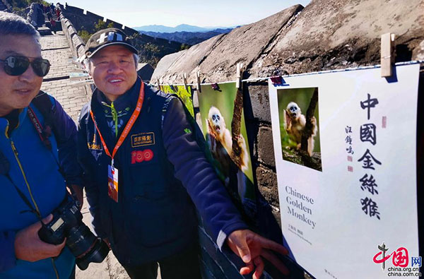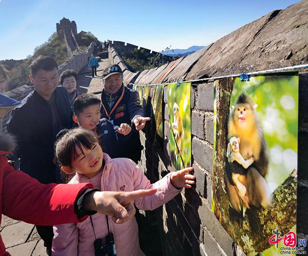 【点睛】 摄影家丁宽亮携金丝猴摄影作品来到金山岭长城,向民众展示金丝猴之美,宣传保护野生动物的理念。