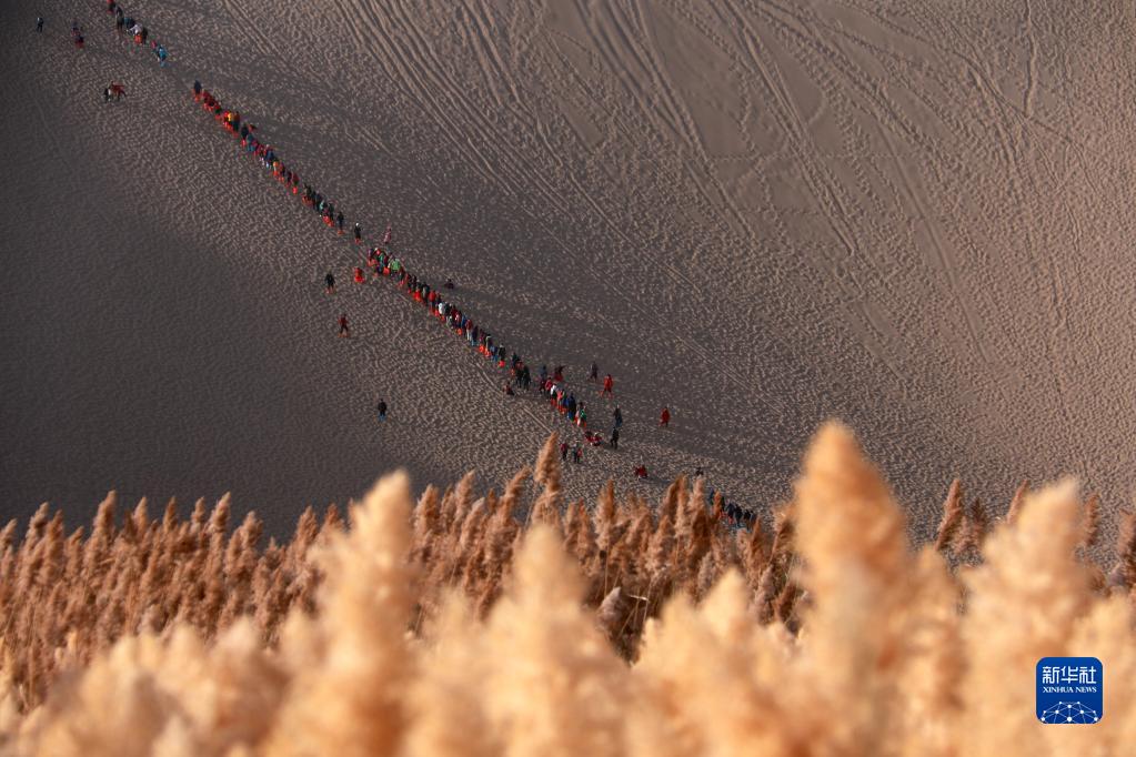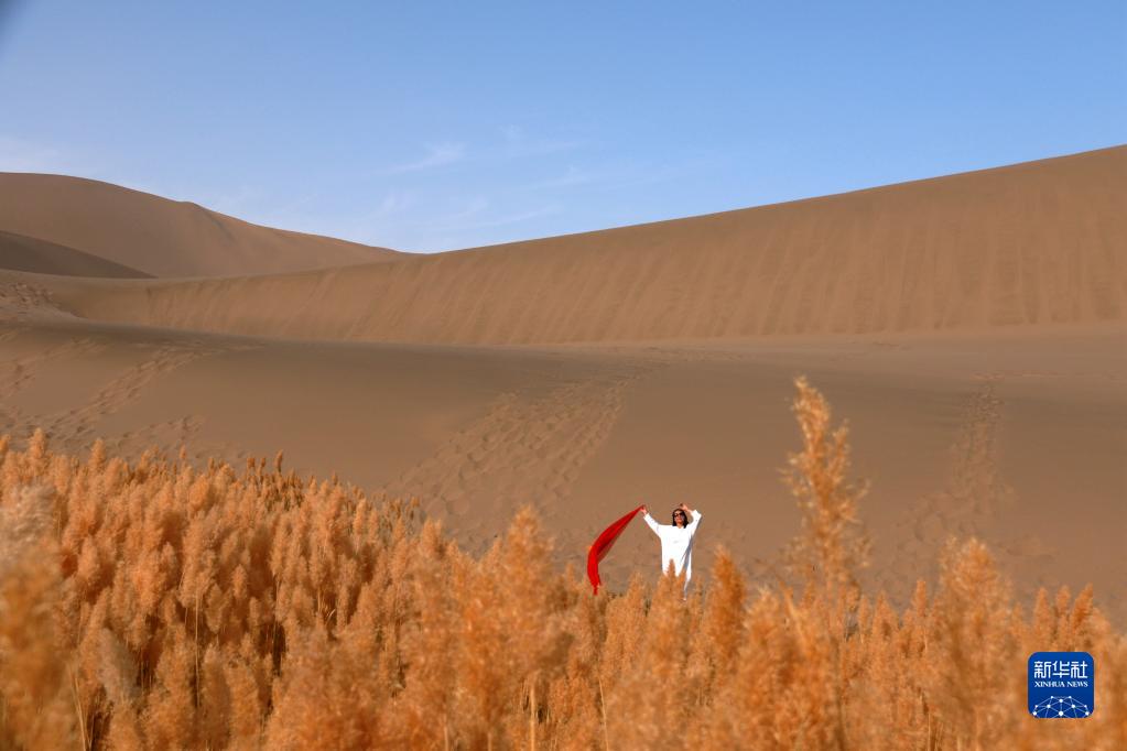 金秋时节,在甘肃省敦煌市鸣沙山月牙泉景区,大漠、驼队、蓝天、泉水、芦苇......构成一幅美丽迷人的画卷,吸引众多游客。新华社发(张晓亮 摄)