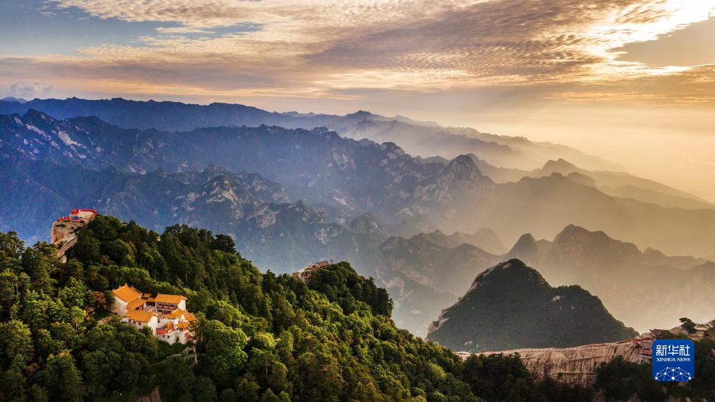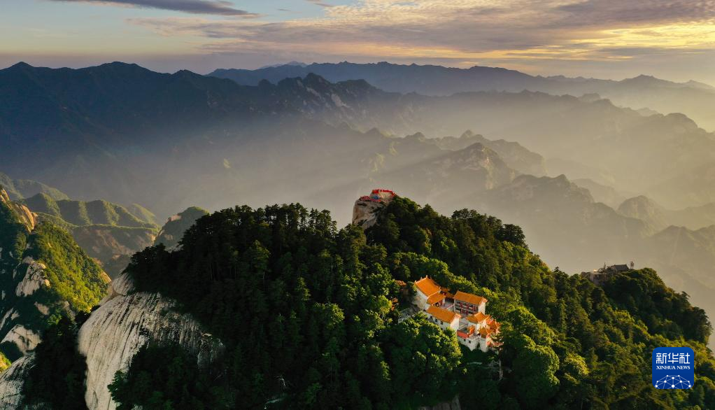 6月19日拍摄的晚霞映照下的华山风光(无人机照片)。