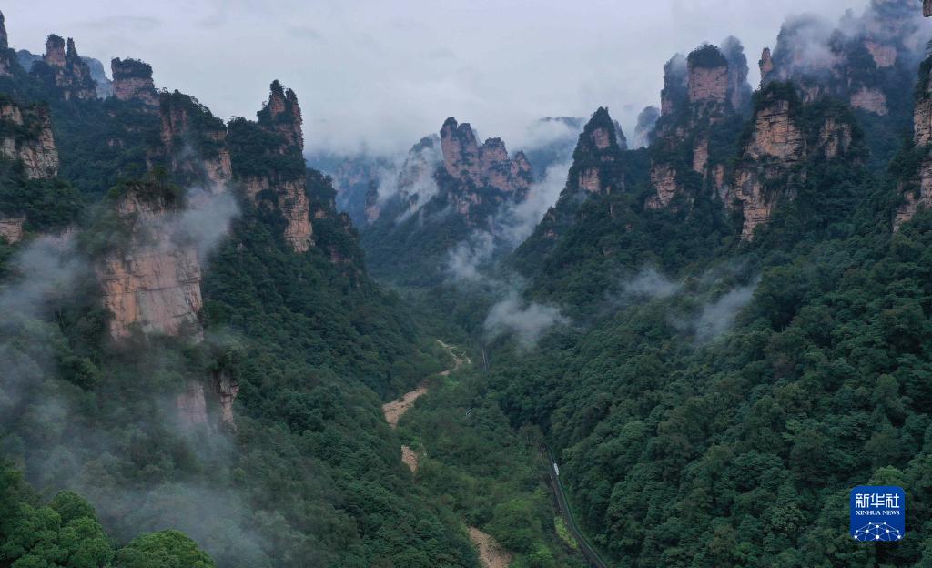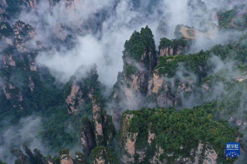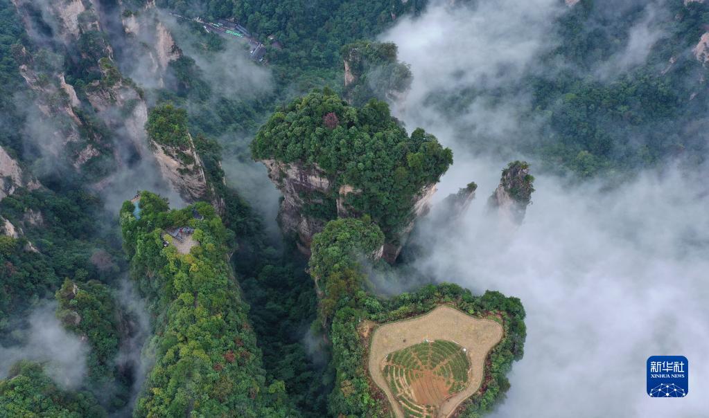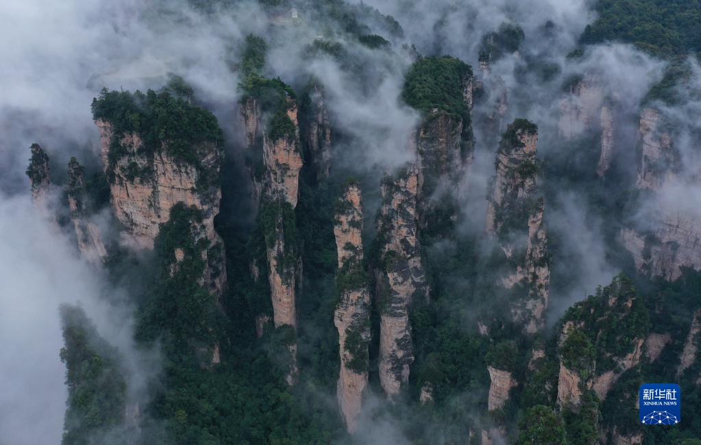 当日,雨后的湖南张家界武陵源,云雾飘荡在峰林之间,若隐若现,美不胜收(无人机照片)。新华社发(吴勇兵 摄)