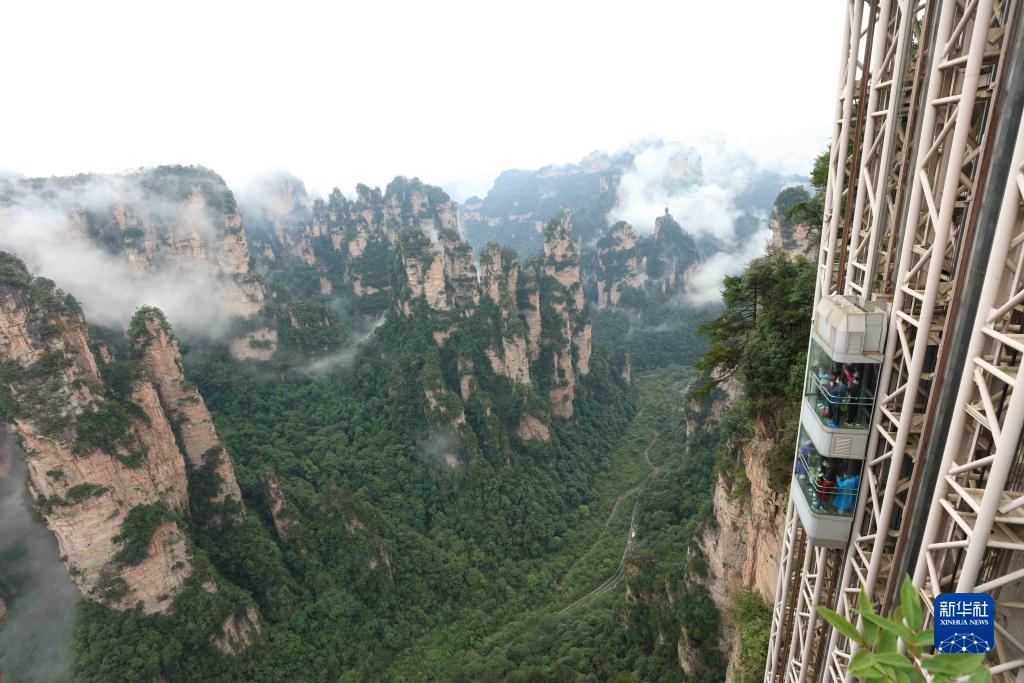 10月19日,游人乘坐百龙天梯欣赏峰林美景。