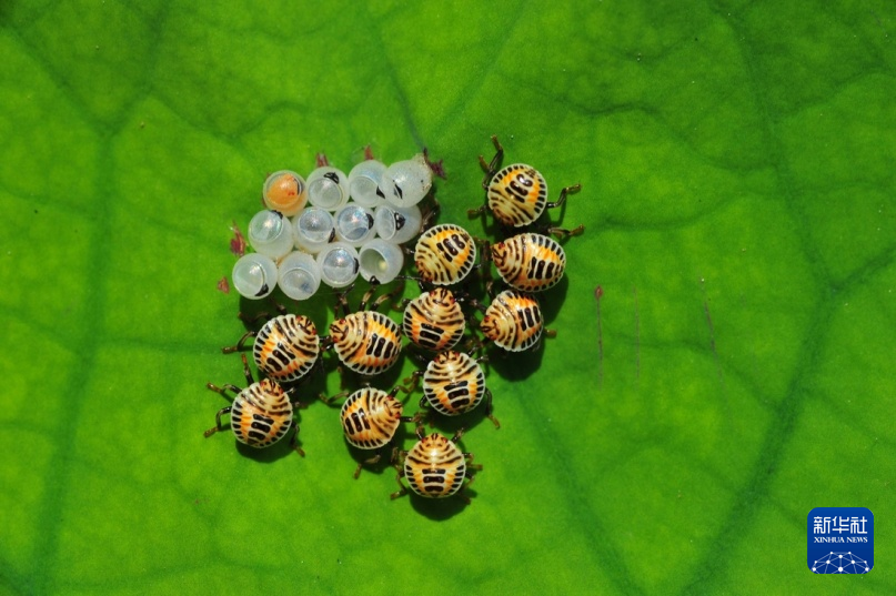 一群蝽宝宝出生后在卵壳旁团聚,它们在等待最后一个未出壳的兄弟。摄影:袁明辉
