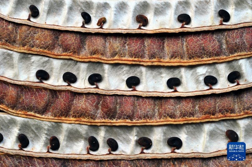 树的豆荚掉落在地上,从三个排列在一起的豆荚中看到了土壤的根系,地面以及一排排树木。摄影:袁明辉