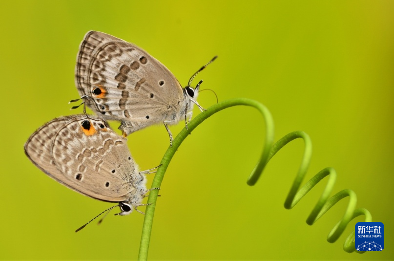 苏铁灰蝶的藤蔓上交尾。柔和的光线照射在苏铁灰蝶身后的芭蕉叶上,螺旋状的藤蔓和交尾的灰蝶之间仿佛具有一种美好的寓意。摄影:袁明辉