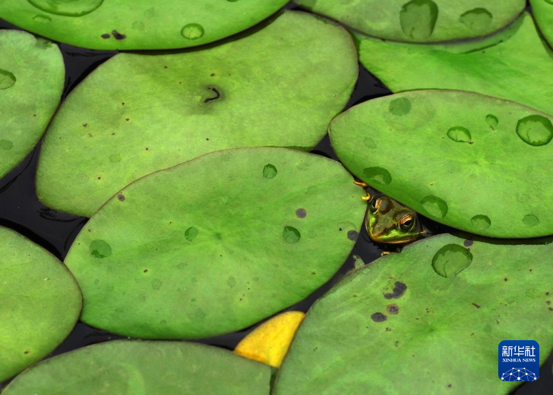 青蛙从睡莲叶子的缝隙间钻出来,通过这个缝隙观察外面的世界。摄影:袁明辉