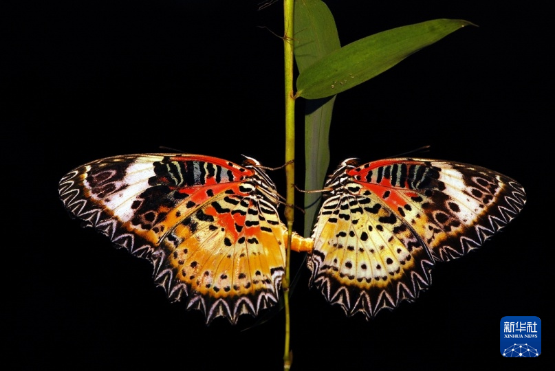 两只梦露蝶正在一根竹枝上交尾,他们侧面的翅膀左右对应,就好像一直梦露蝶在展开翅膀。摄影:袁明辉