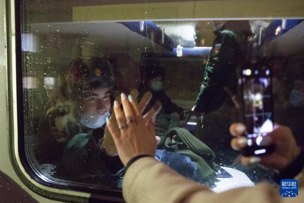 10月27日晚,应征入伍人员在俄罗斯圣彼得堡火车站与亲友告别,乘火车前往服役地。 据俄罗斯国防部消息,俄罗斯2021年秋季征兵工作于10月1日开始。 新华社发(莫京娜摄)