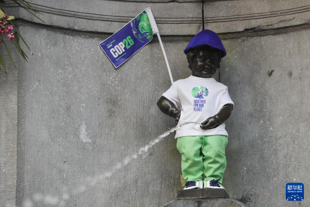 当天,工作人员为布鲁塞尔著名雕塑“小尿童”换上装扮,以呼应即将在英国格拉斯哥召开的《联合国气候变化框架公约》第二十六次缔约方大会。 新华社记者 郑焕松 摄