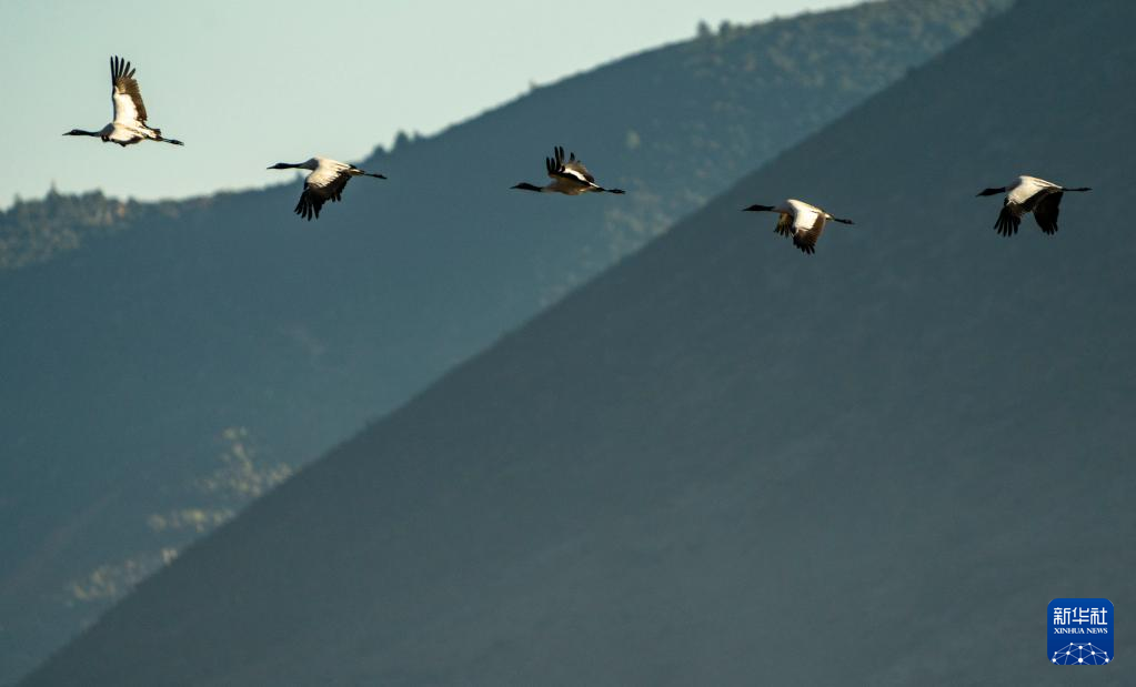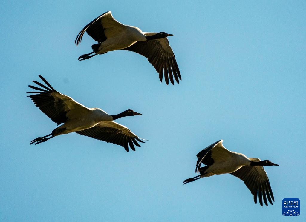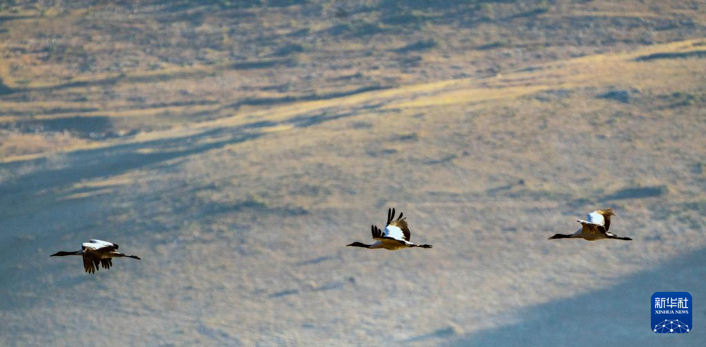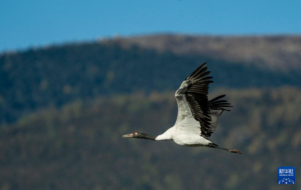 10月29日,黑颈鹤飞翔在纳帕海上空。