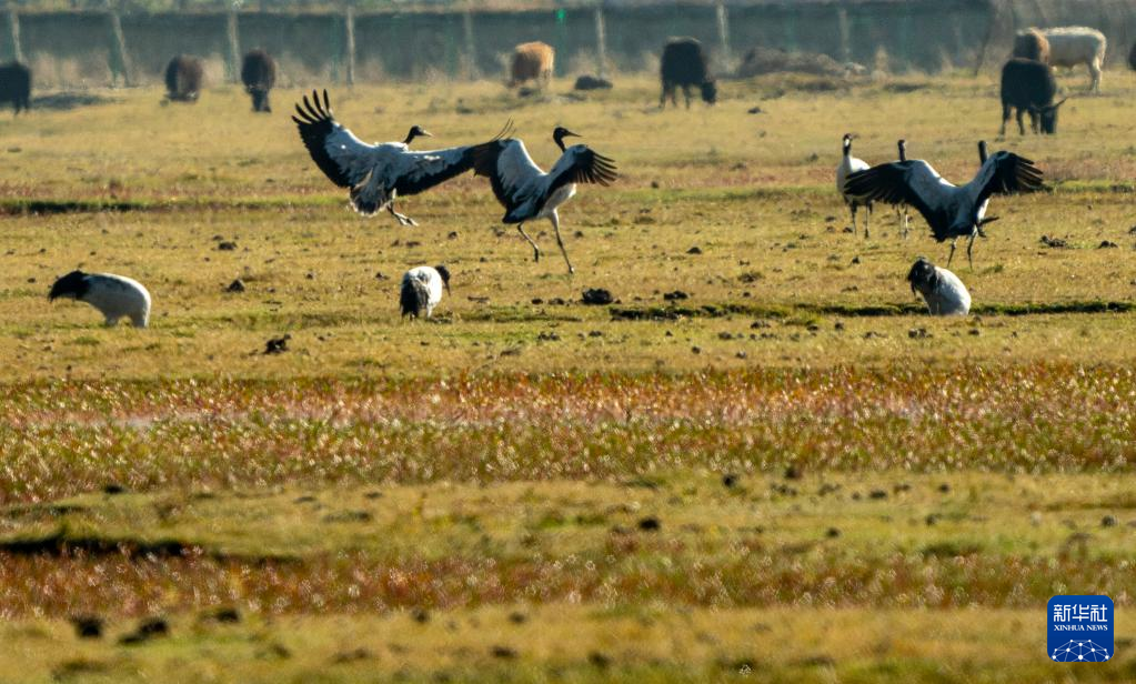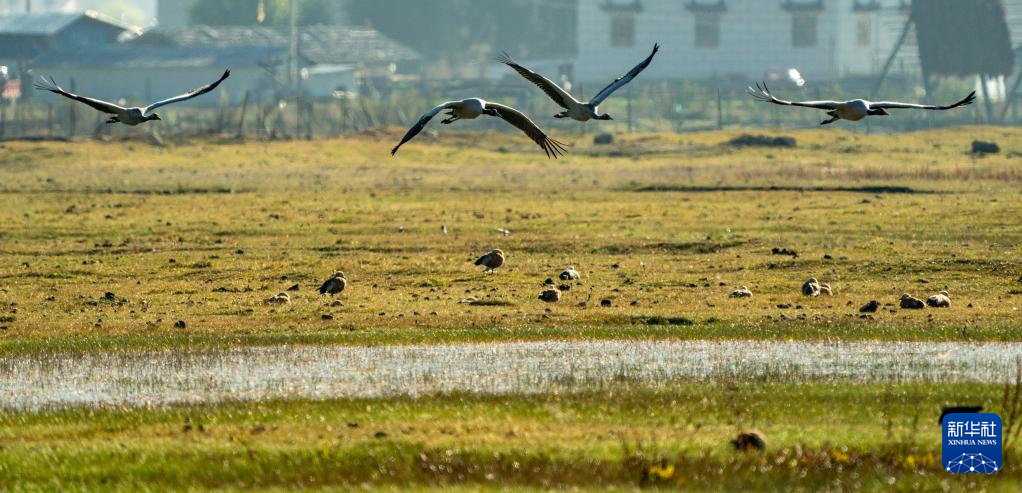 入秋以来,云南省迪庆藏族自治州香格里拉市纳帕海国际重要湿地迎来越冬黑颈鹤。首批黑颈鹤抵达以来,已监测到200余只。 纳帕海,藏语意为“森林背后的湖泊”。2016年以来,纳帕海共恢复湿地面积6300余亩。管护局、群众投放食物,确保鸟类有足够的食物来源,维护湿地生物多样性。随着管护工作不断加强,湿地生态环境持续向好,黑颈鹤、黑鹳等国家一级保护动物数量不断增加。 新华社记者 江文耀 摄