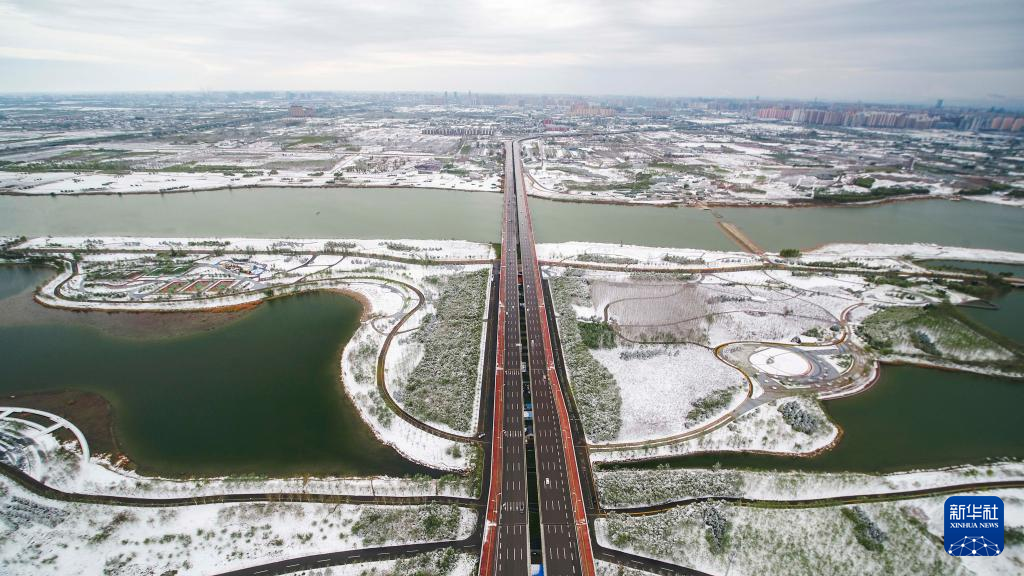 这是11月7日拍摄的石家庄市滹沱河生态景区雪景(无人机照片)。 当日是“立冬”节气,受寒潮影响,全国多地迎来降雪天气。 新华社发(陈其保摄)