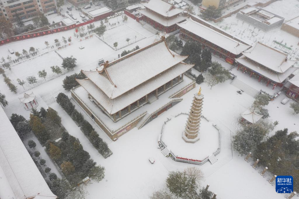 11月6日拍摄的雪中甘肃省武威市鸠摩罗什寺(无人机照片)。 当日,受强冷空气影响,甘肃多地降雪。 新华社发(姜爱平摄)