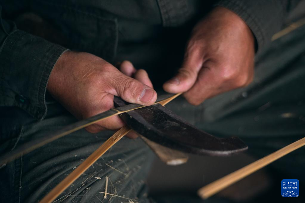 11月2日,在浙江省杭州市临安区锦南街道横岭村,潘云峰用竹刀将竹子削成可供编织的竹篾。