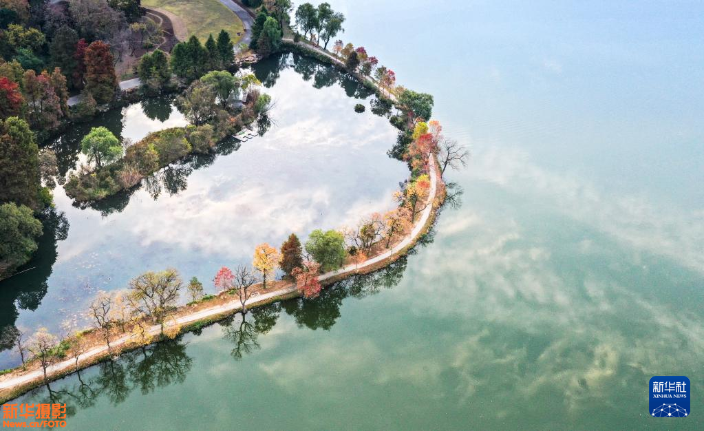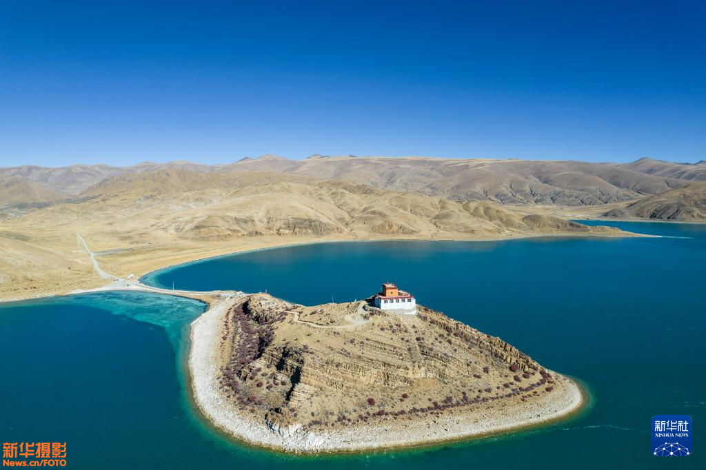 这是11月16日拍摄的羊卓雍措和坐落在湖畔的日托寺(无人机照片)。