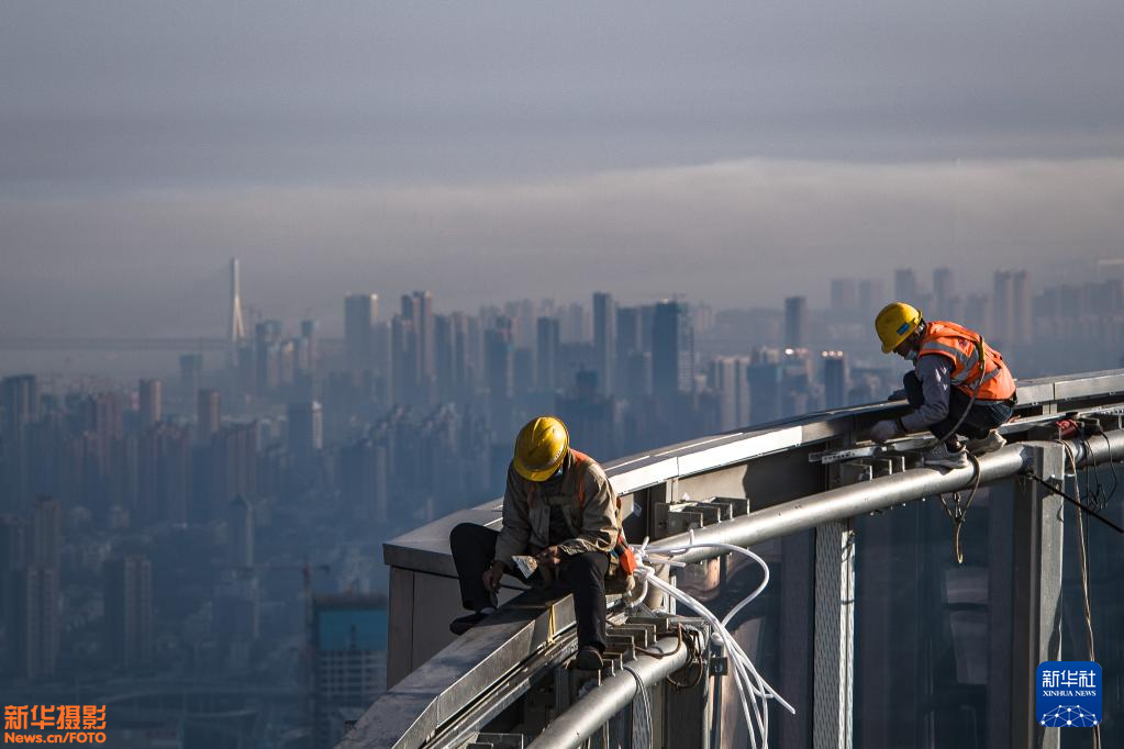 在武汉绿地中心项目建设现场近500米高的“云端”,近百名中建三局二公司的工人,伴着脚下的长江波涛,稳步推进工程建设,仿佛演奏着“交响曲”。新华社记者 肖艺九 摄