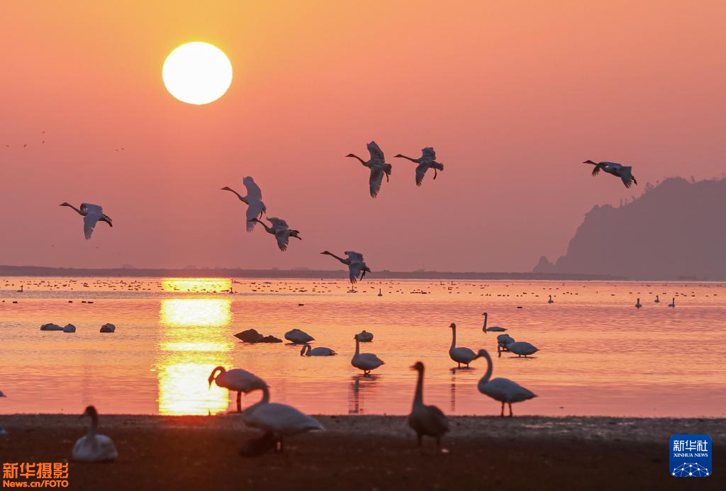冬日清晨,在山东省荣成市成山镇天鹅湖,大天鹅在晨曦中游弋、漫步、觅食,构成一幅和谐的生态画卷。新华社发(李信君摄)