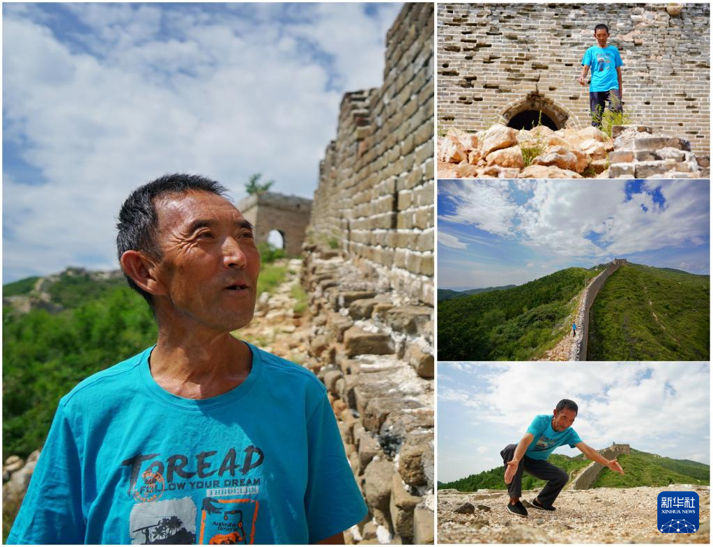 这是一张拼版照片(均为2020年9月4日摄)。左图为李德旺在讲述自己巡视长城的经历;右上图为李德旺在长城上巡视;右中图为李德旺行走在徐流口段长城上;右下图为李德旺在徐流口段长城一座敌楼顶部介绍发现明代万历年间石碑的过程。