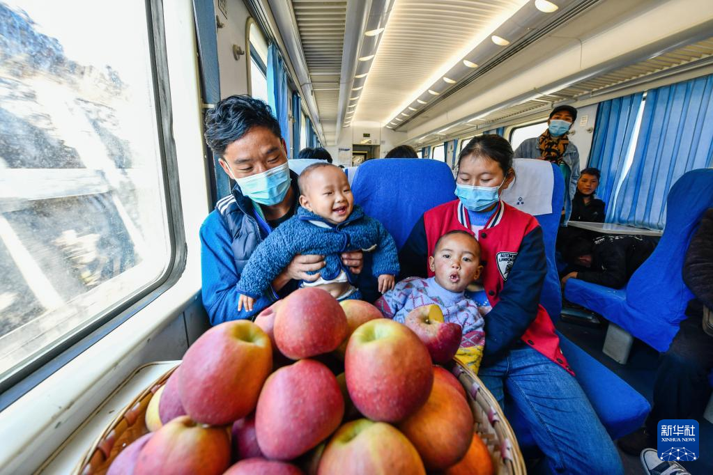 11月30日,来自四川省凉山彝族自治州金阳县的彝族青年比么有呷(左一)与妻儿,乘坐5647次列车至贵州六盘水市转车前往广东省中山市务工。