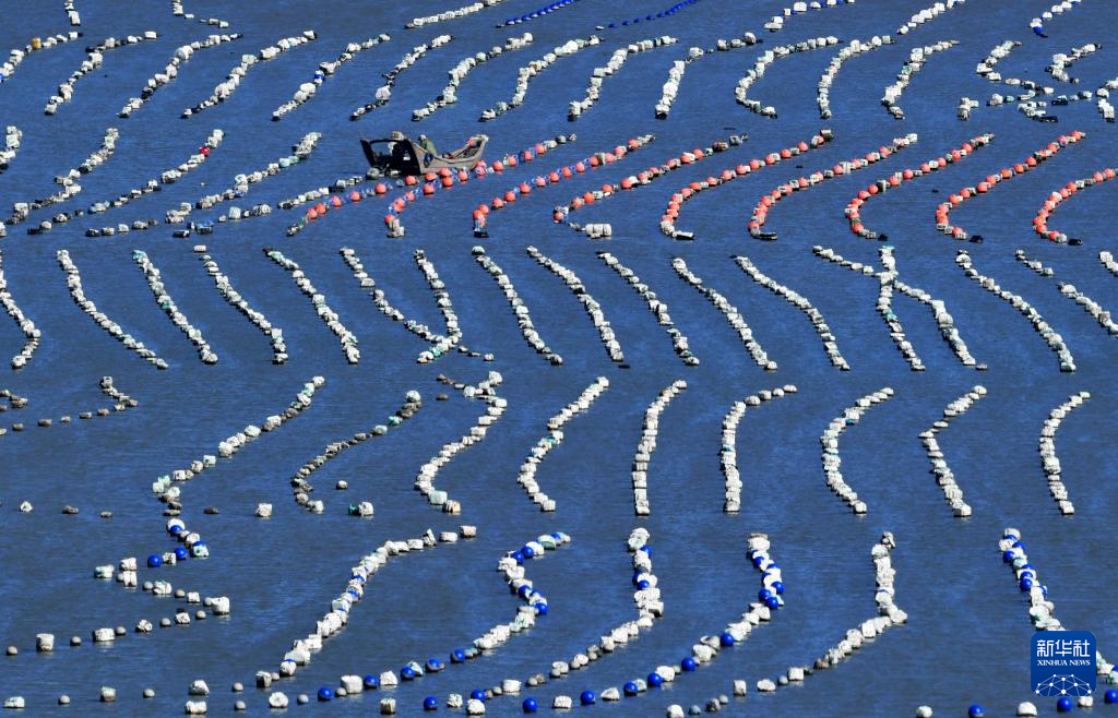 在福建省福州市连江县的“海上牧场”,渔民驾船穿梭在一串串彩色浮球和养殖网箱之间,织就一幅海上牧场渔耕图。