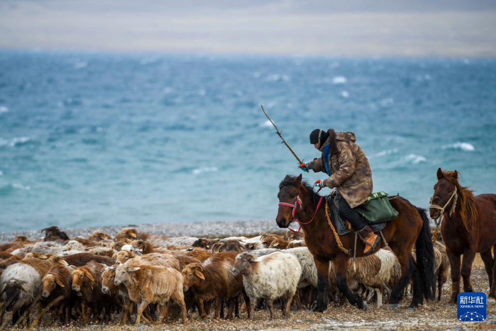 在新疆赛里木湖畔,来自伊犁哈萨克自治州霍城县的牧民在转场(11月26日摄)。