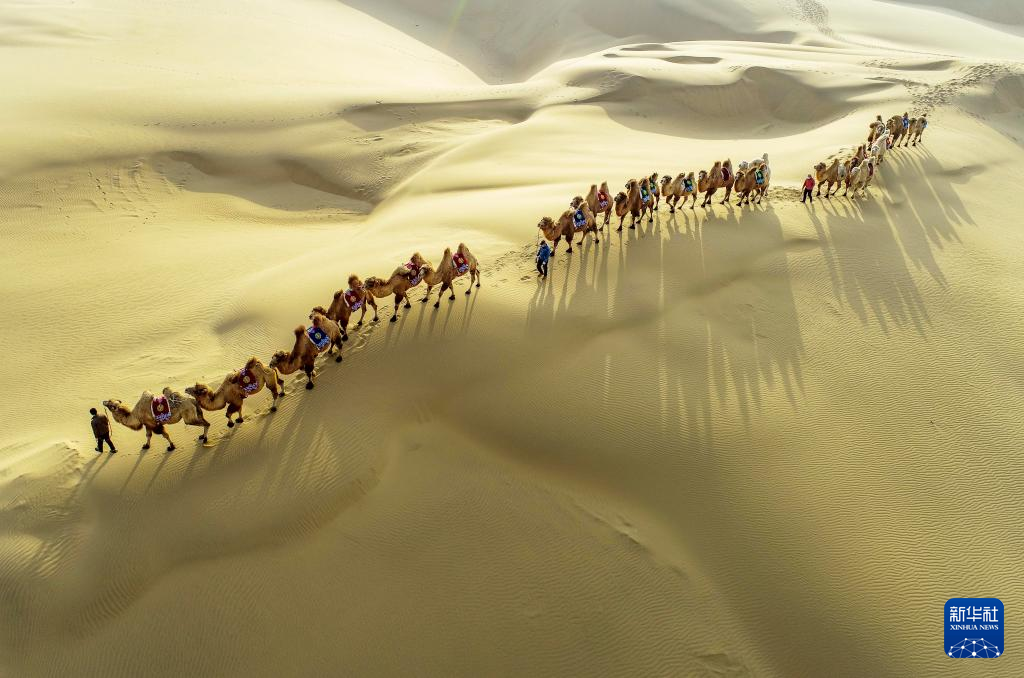冬日,位于内蒙古自治区鄂尔多斯市的库布其沙漠壮美而静谧,驼队行走其中,构成一幅沙海画卷。
