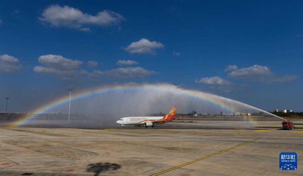 12月2日,海口美兰国际机场二期停机坪,首班海南航空客机通过水门。
