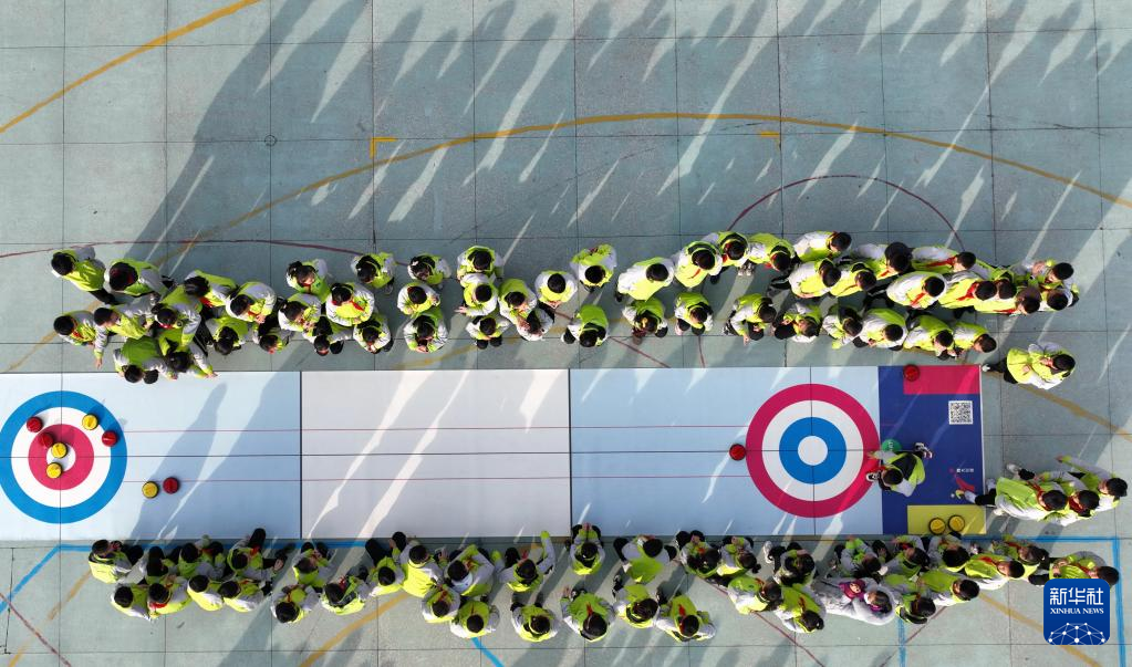12月15日,在河北省滦州市第三实验小学,学生们在体育课上体验旱地冰壶(无人机照片)。