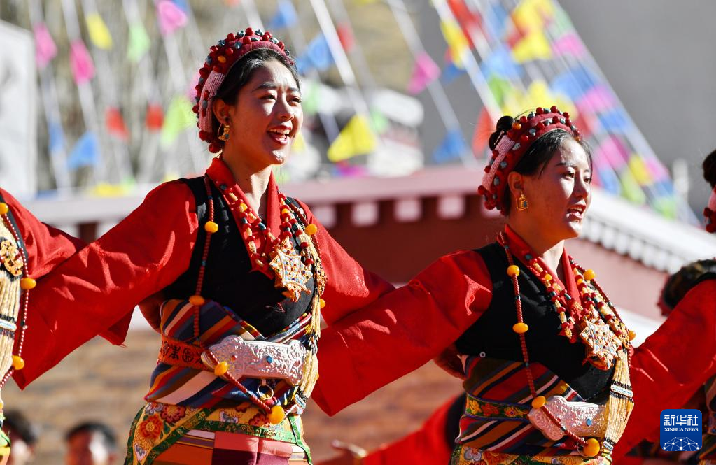 12月10日,在西藏康马县2021年产业竞赛暨冬季物资交流会开幕式上,来自拉孜县的演员在表演节目。