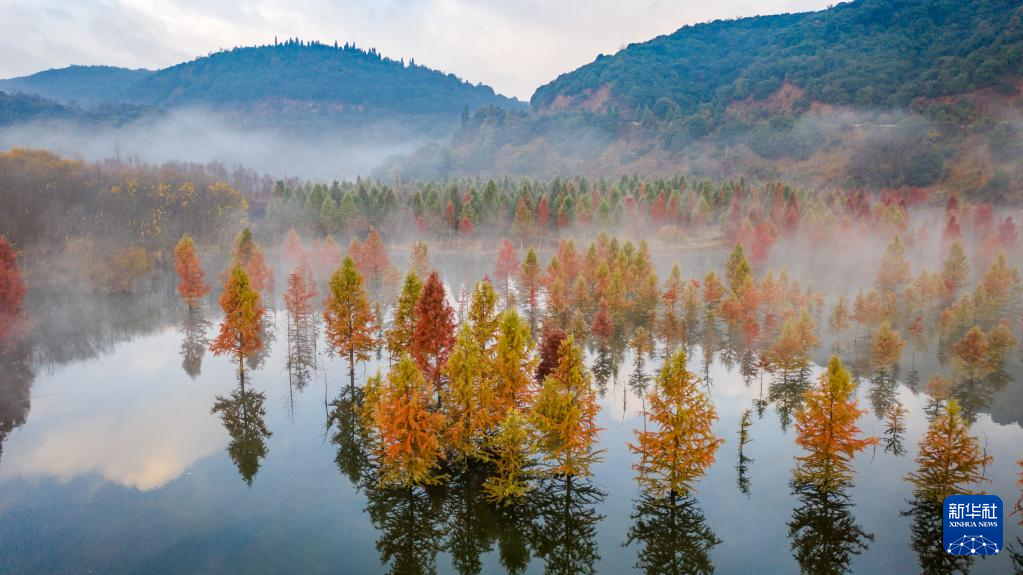 冬日,云南省昆明市盘龙区滇源街道甸尾村水杉湿地的水杉林色彩艳丽,景色如画。这片水杉湿地位于滇池上游、昆明松华坝水源保护区内。