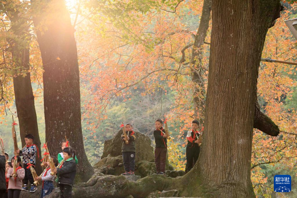 12月14日,在桂黔交界乌英苗寨教学点“芦笙文化进校园”课堂上,学生们在校门口的老枫树下学习吹芦笙。