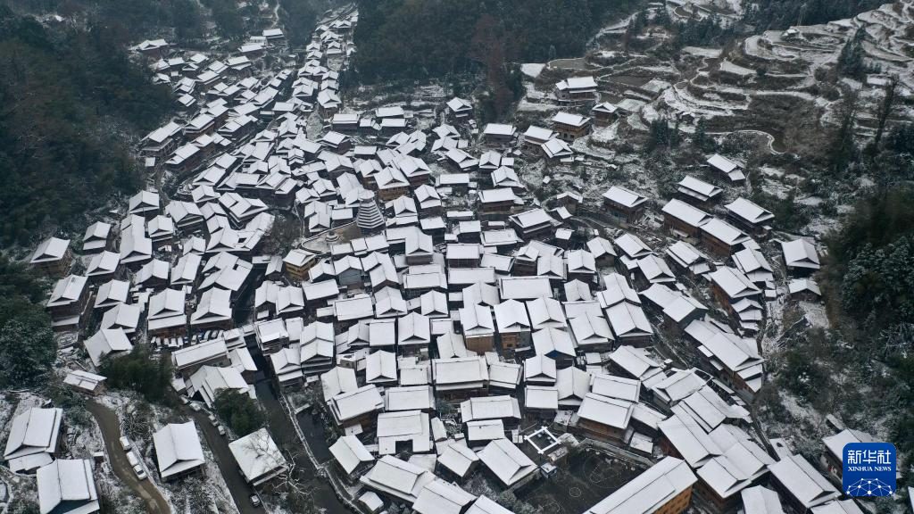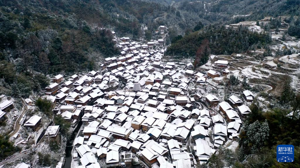 12月28日拍摄的贵州省丹寨县龙泉镇高要村雪后苗寨梯田景色(无人机照片)。
