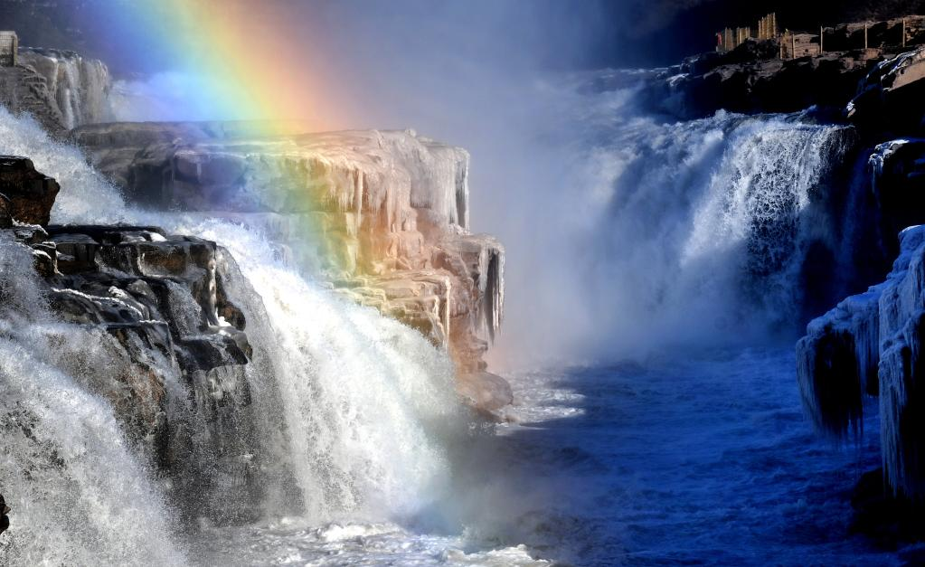 黄河壶口瀑布冰瀑与彩虹交相辉映(12月21日摄)。