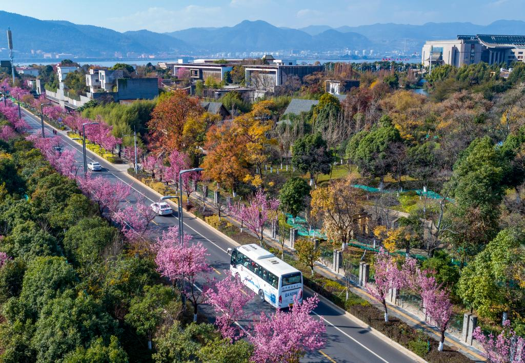 这是12月21日拍摄的昆明市红塔西路绽放的冬樱花(无人机照片)。