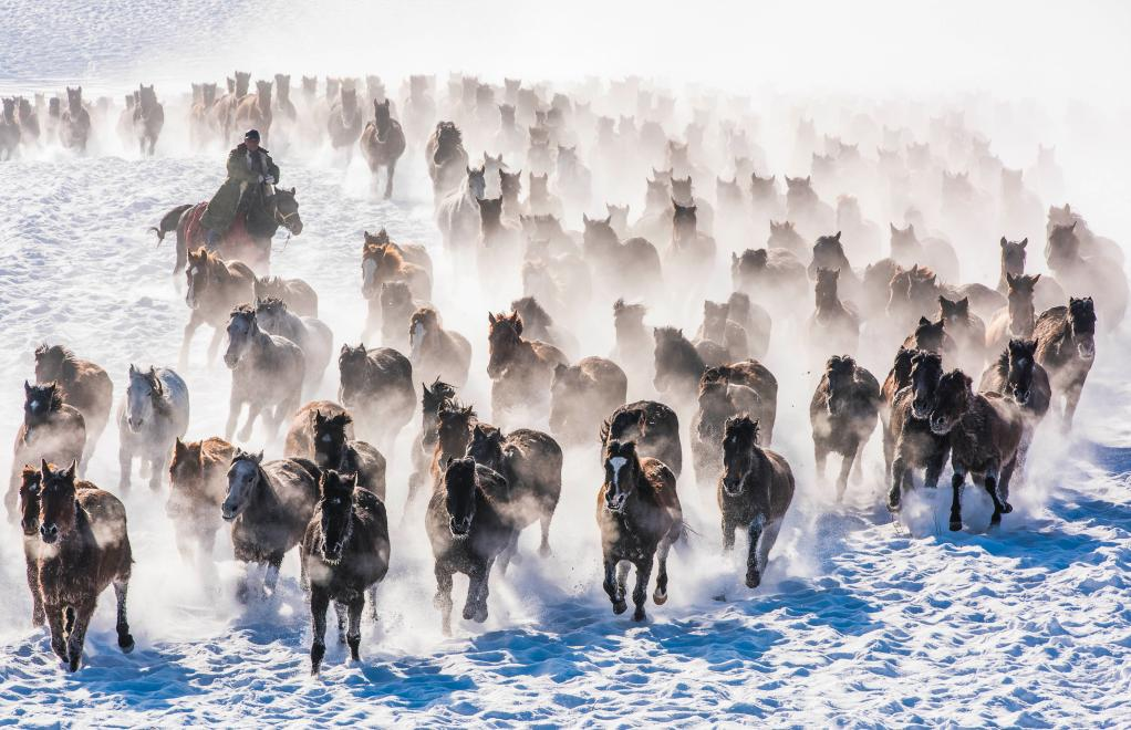 在新疆昭苏县,骏马在雪原上奔驰(12月20日摄)。