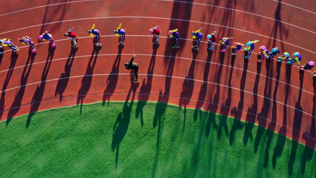 12月17日,河北省唐山市曹妃甸区唐海镇新立小学的学生在操场练习轮滑(无人机照片)。