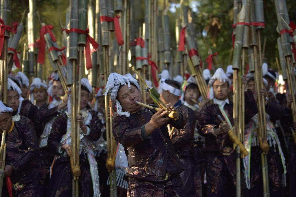 12月22日,贵州从江县丙妹镇岜沙苗寨芦笙手在吹奏芦笙。